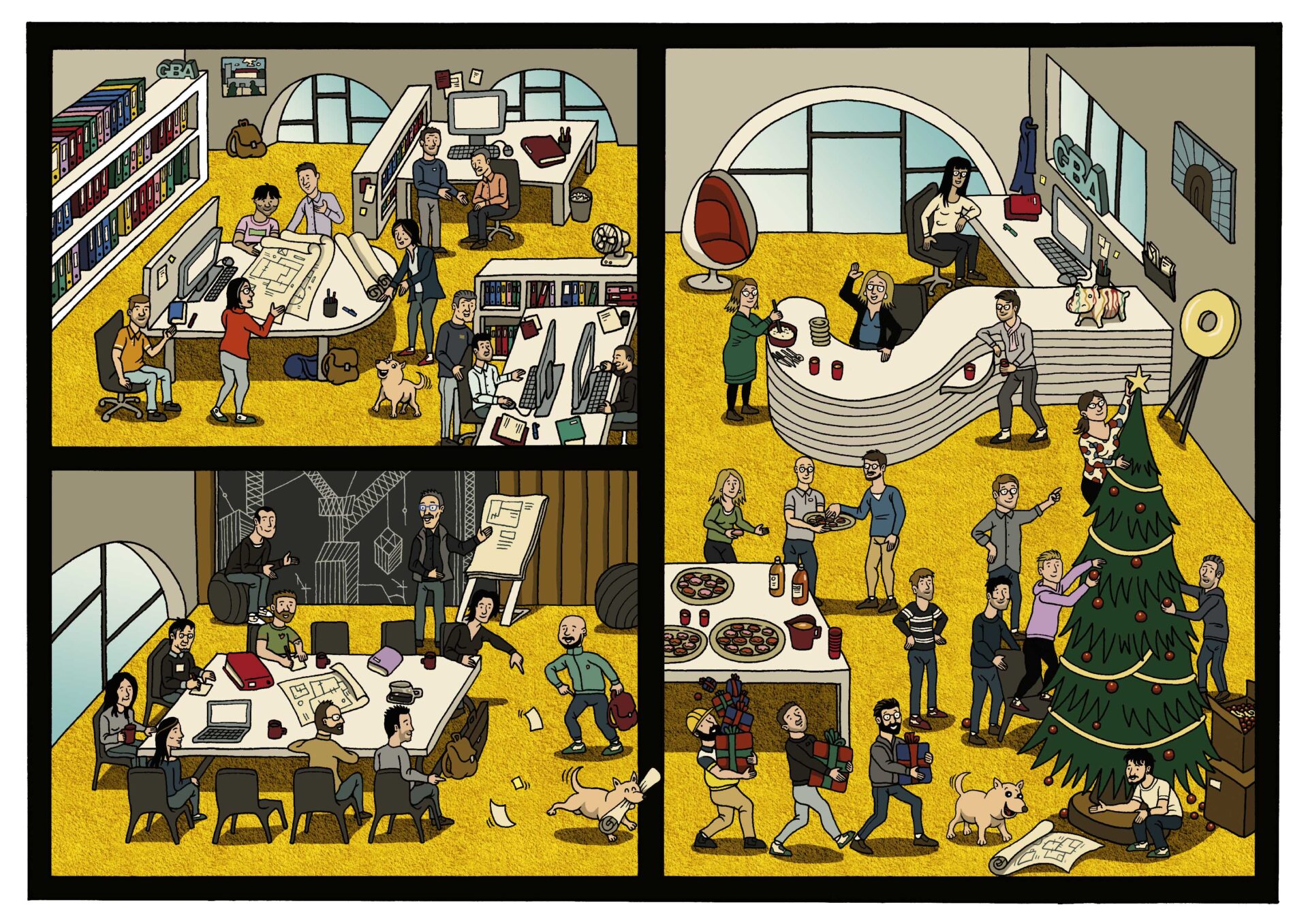 Le but de ces cartes était de représenter l’intégralité des collaborateurs du bureau dans différentes scènes de fêtes fourmillant de détails humoristiques librement inspirées des livres « Où est Charlie ? ».